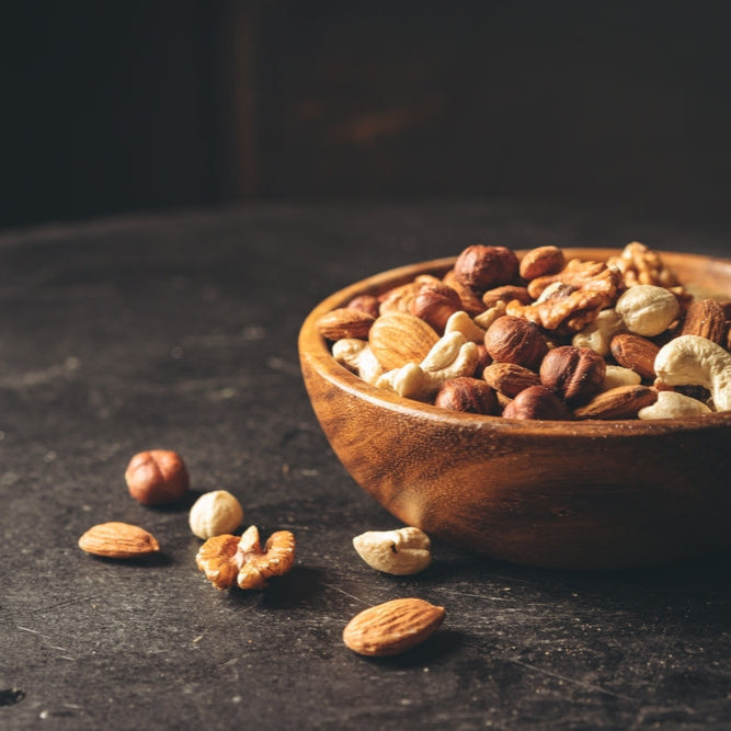 Packed with vitamin E, magnesium, and poly-unsaturated fats (omega-6 & omega-3 fatty acids), nuts contribute to heart health by lowering bad cholesterol levels.